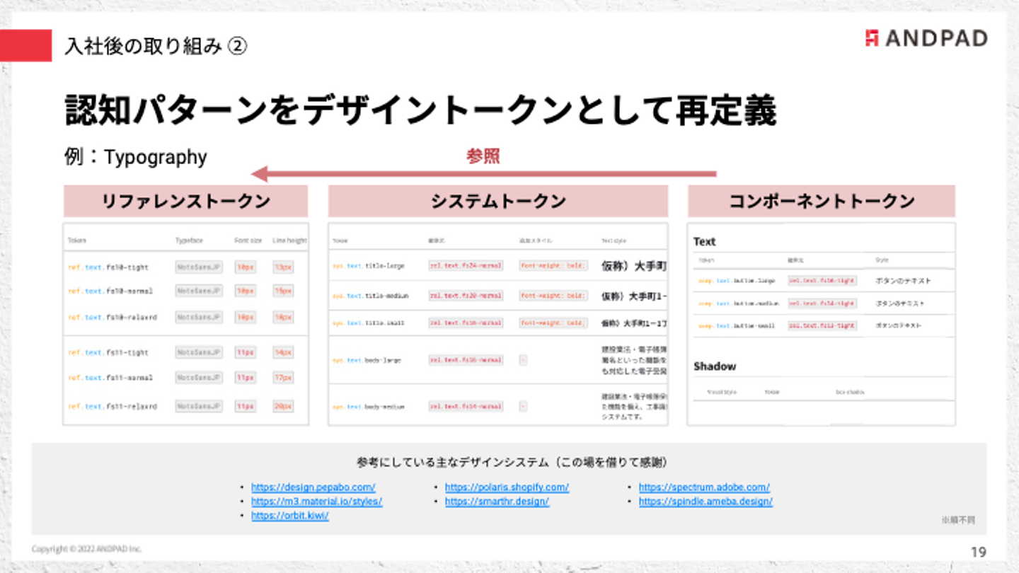 具体的には、色やタイポグラフィーなどの認知パターンをデザイントークンとして定義しなおし、それを元に既存のコンポーネントの作り直しやシステム化をしています。以前は、決まったルールがないなか、手探りで進めている状態だったのですが、デザイントークンの定義後は、設計を進めやすくなりました。