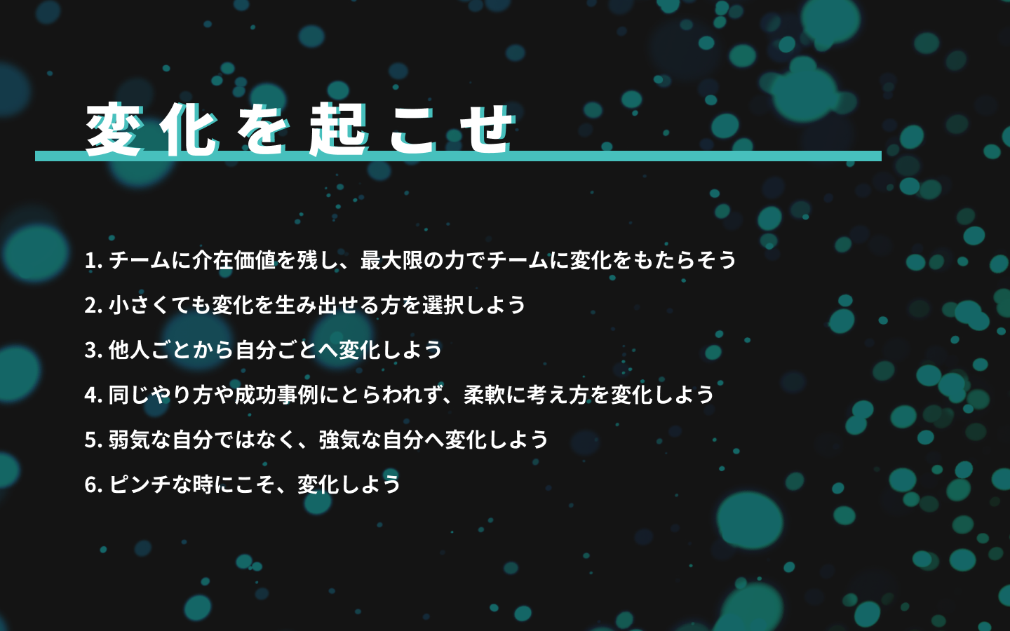 そんな中、2021年は「ストーリーを進める」というバリューを「変化を起こせ」という名称へ変更致しました。前述の通り基本的に大事にしたいことは変わらないのですが、言葉をより身近なものや使いやすいものにしていくことでメンバーの意識も変わってきた気がしています。