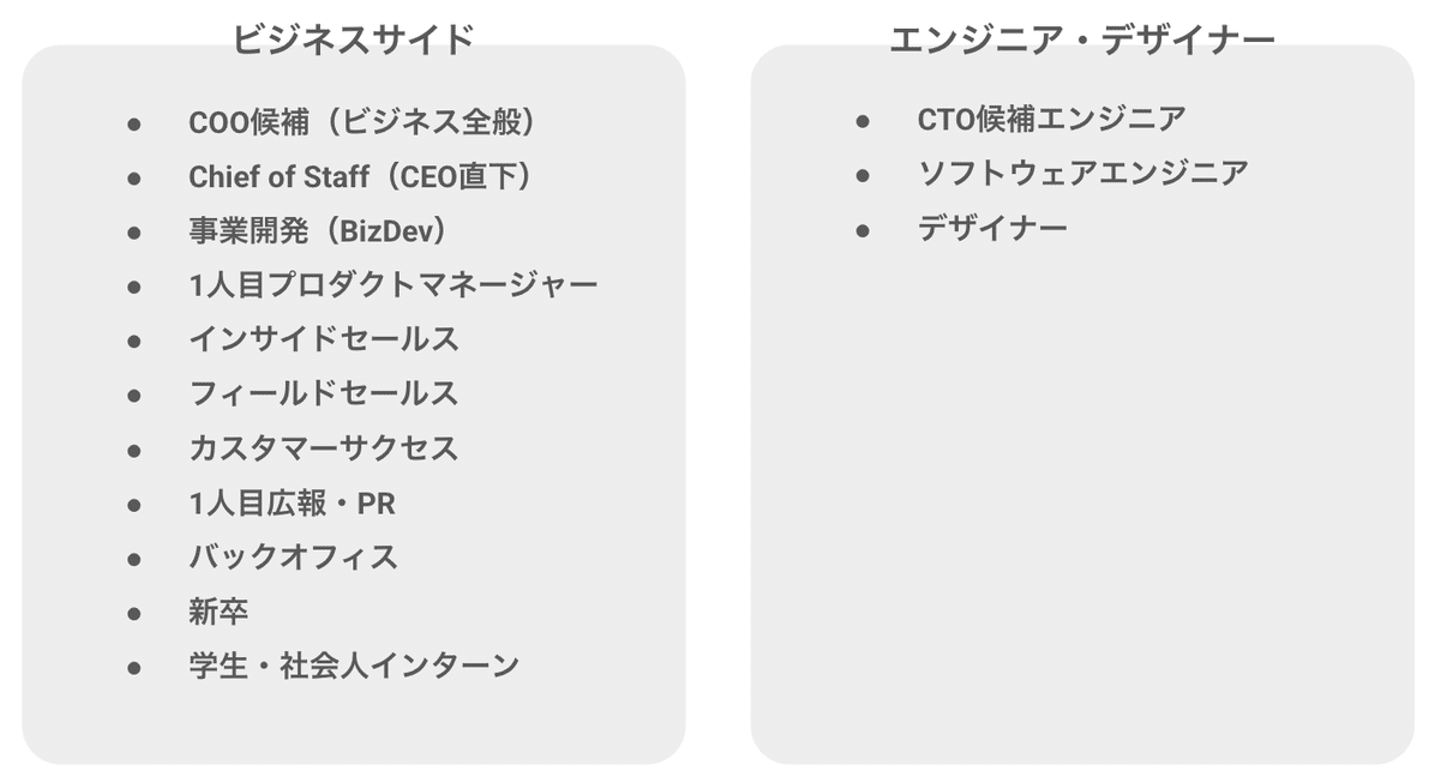 - 事業:30代および人生をかけてフルコミットしたいと思えるほど共感できて、成長フェーズにあること