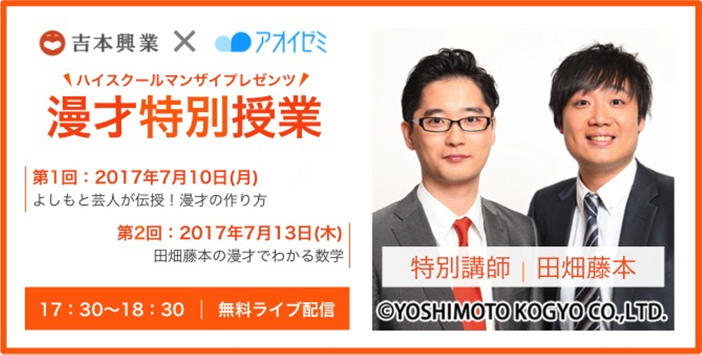 吉本興業が主催する ハイスクールマンザイ2017との共同企画で実現したこの授業は、特別講師に東大芸人として人気上昇中のお笑いコンビ”田畑藤本”さんをお迎えして行います。