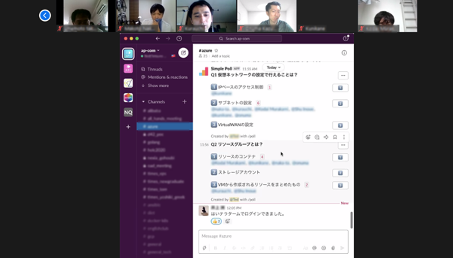 ハンズオンは基本的に個人ワークですが、質問やトラブル対応は、Zoomの画面共有機能やSlackを使って、講師とサブ講師が連携してサポート。トラブルシューティングははたから見ていてもドキドキしますが、解決へのプロセスを見られる貴重な体験です。