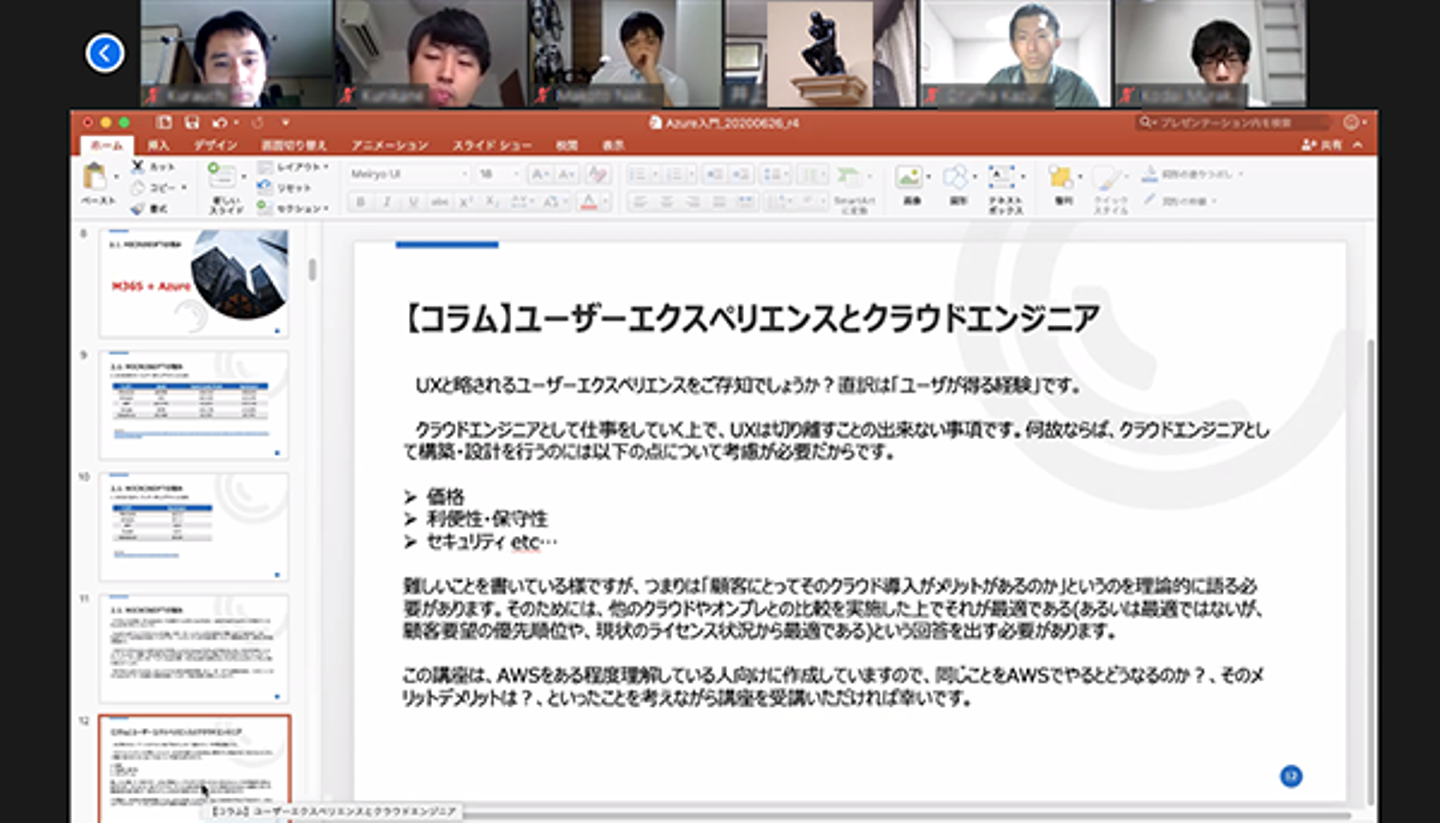 参加者全員で業務内容や今どのくらいAzureに携わっているかを含めた自己紹介をして、早速講座スタートです。