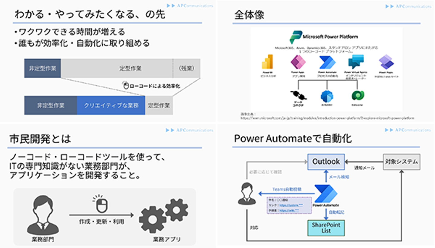 繰り返しの単純作業や、ツール間の転記作業などに時間を取られている、と感じる方に特にオススメしたい講座です。Power Platformはローコードツールなので、プログラミング経験がなくてもアプリ開発や作業の自動化をすることができます。本講座では、Power Platformの各ツールでできることや、実際に業務効率化を行った事例を紹介しており、ご自身の業務にも適用できそうなところを見つけていただけると思います。