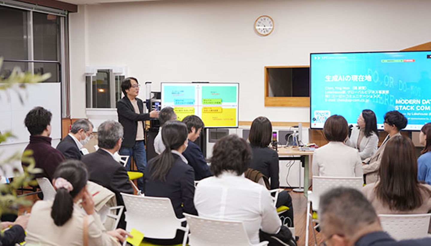 続いて、講師のAPCエンジニア陳による「生成AIの現在地」セミナーが実施されました。このセミナーでは、生成AIの応用例や動作原理、日本と世界とを比較した生成AIの歴史、そして現場から見た生成AIプロジェクトの運用プロセスについて解説されました。さらに、参加者のキャリア形成と生成AIの関連性や可能性を見つけるためのヒントも紹介され、生成AIをエンジニアの視点から解説しながら、参加者との交流を深めました。また、陳の他にもエンジニア2名がディスカッションに参加し、実際の案件事例についても紹介しました。