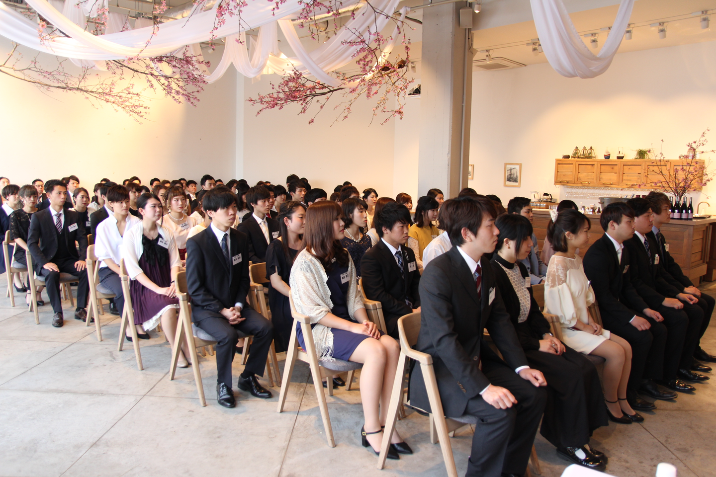 入り口にちらっと写っているのが、今回の入社式を取り仕切っていた、人材開発部の尾形さんです。なんと白のワンピース! 主役並みに気合入っています。笑