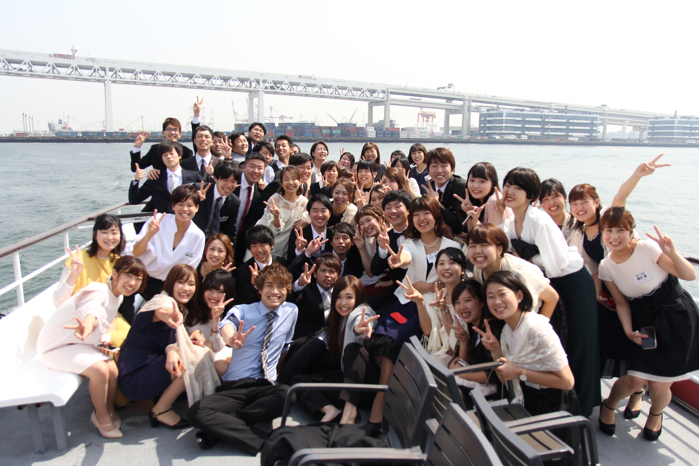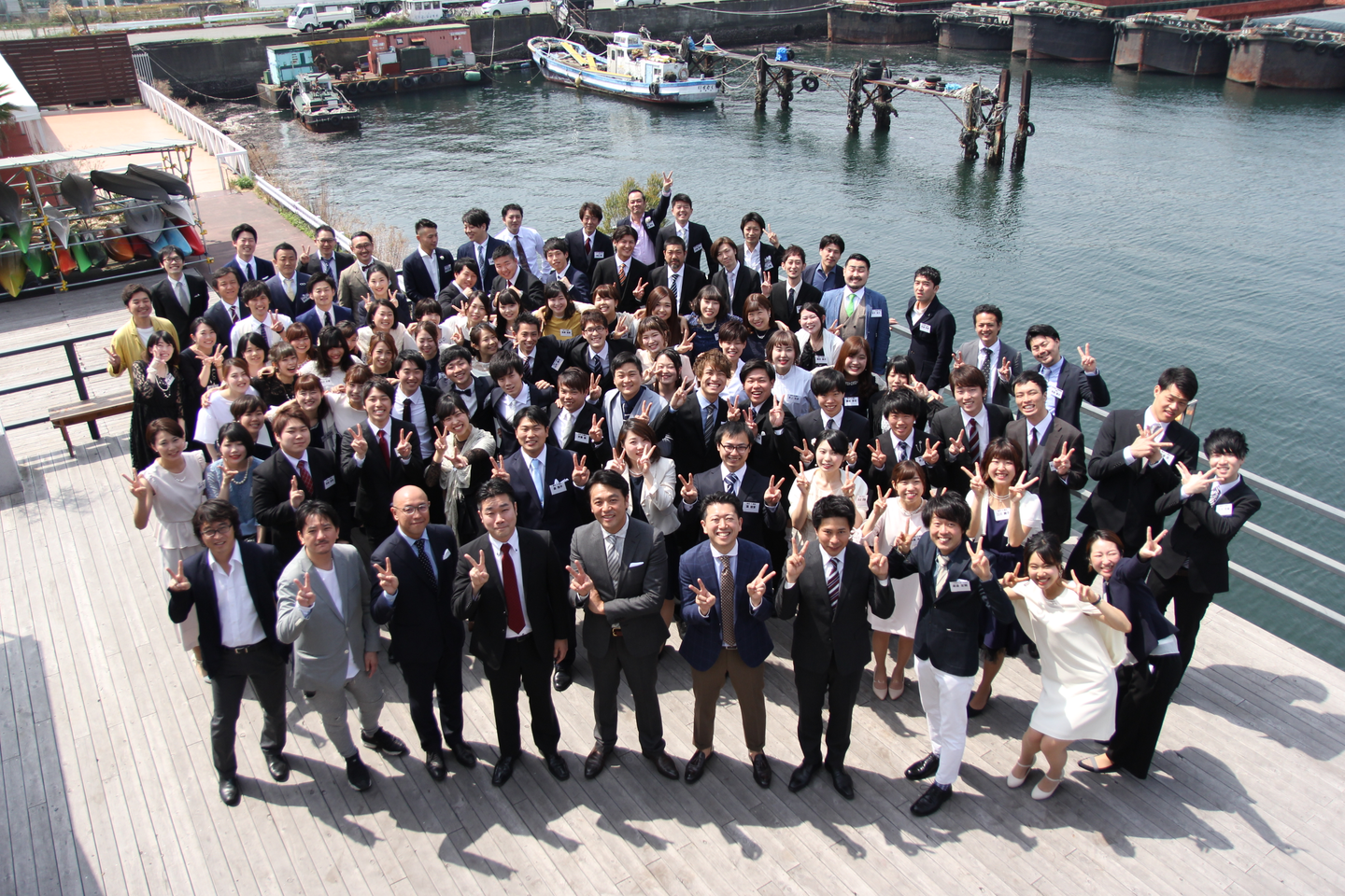 厳かながら、笑いありの入社式が終わったら、デッキで記念撮影です。