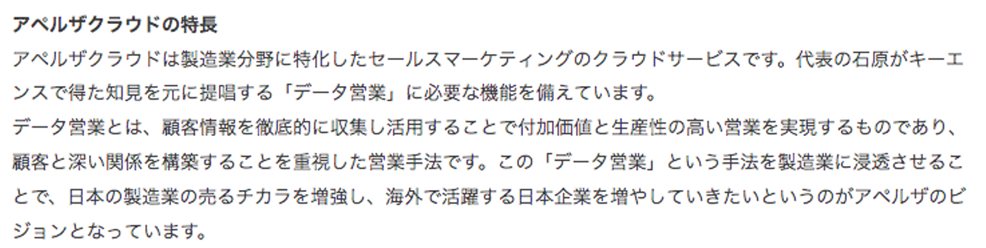そうですね。一言で言うと製造業に特化した営業活動のためのクラウドサービス。といったところです。
