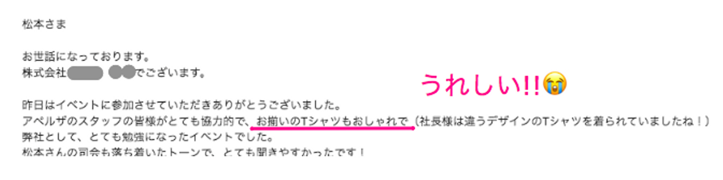 素敵なデザインで作成できたものの、まるで私服かのようにコーディネートできるため、せっかく着ていても「アペルザのTシャツ」と認知してもらえないことがよくあります(苦笑)