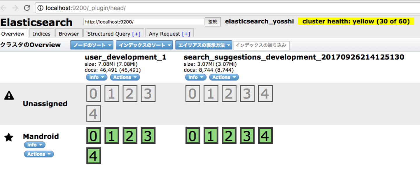 [2018-02-25 16:53:57,592][INFO ][cluster.routing.allocation] [Mandroid] Cluster health status changed from [RED] to [YELLOW] (reason: [shards started [[post_development_3][1]] ...]).デフォルトはlocalhostの9200番でサーバーが立ちます。 また、