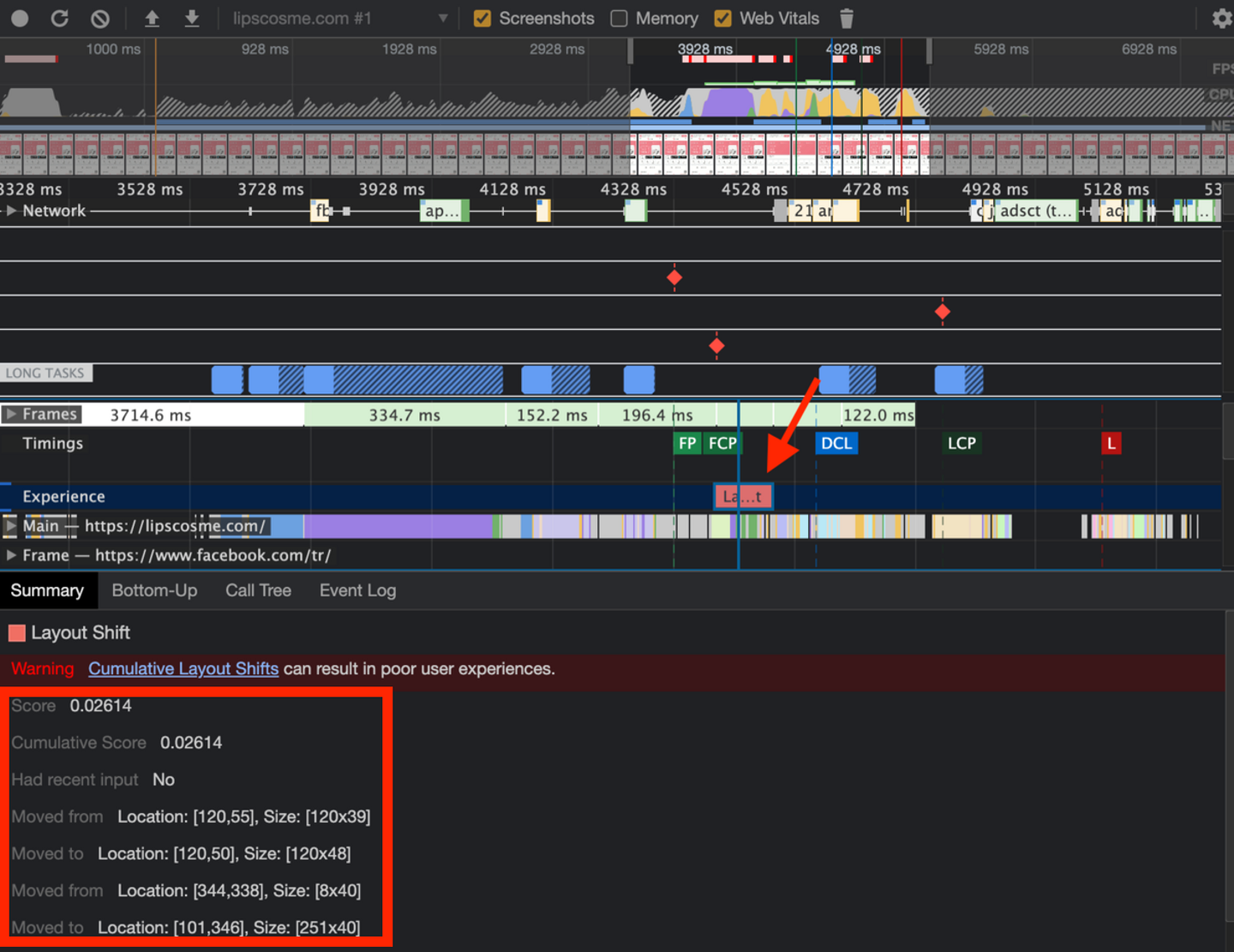 結果のExperience項目をクリックすると、Summaryタブに詳細が表示され、どのように要素が動きCLSが発生したかを確認できます。