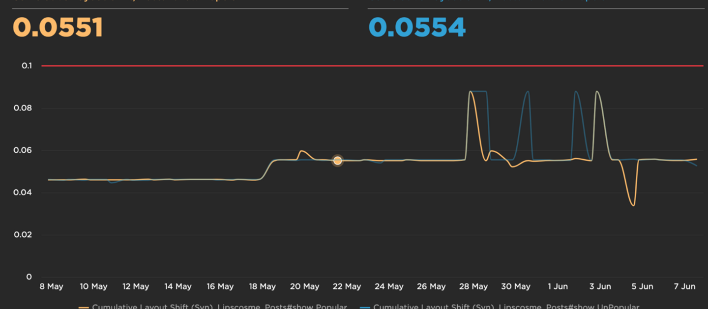 今回アラートがなったページは、Googleのオーバーレイ広告を動的に挿入する際に要素が動いていたことが原因で、それを解消するとCLSがCWVにおける合格ライン(0.1)を下回りました。