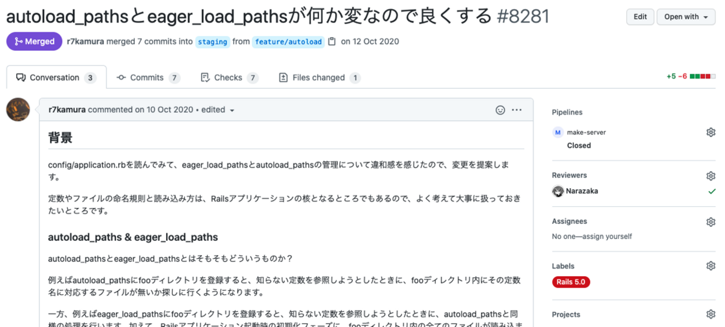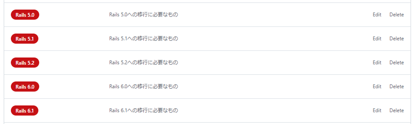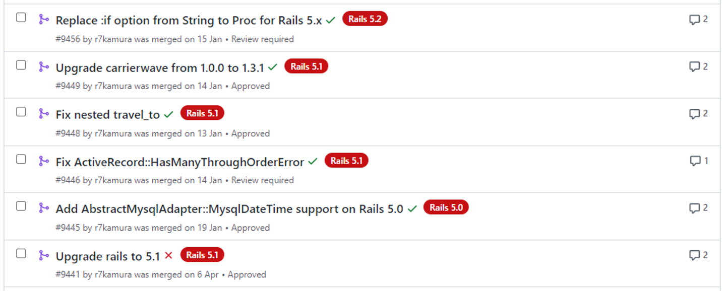 ほか個人的によくやっている運用として、個々のPull Requestに「Rails 6.0」「Rails 6.1」のようにマイナーバージョンのラベルを付けていきました。 あとで振り返ったときに掛かった工数や変更内容が分かりやすいからという理由もあるのですが、非同期で仕事を回せるようにというのが1番の理由です。 Rails 6.0の動作検証をやってもらっている間にRails 6.1のための変更をレビューしてもらったり、Rails 6.0の動作検証での問題対応用に優先して見てほしい変更を出したりと、色々なPull Requestが出ることになるので、交通整理のためにやっておいて良かったことの一つだと思います。