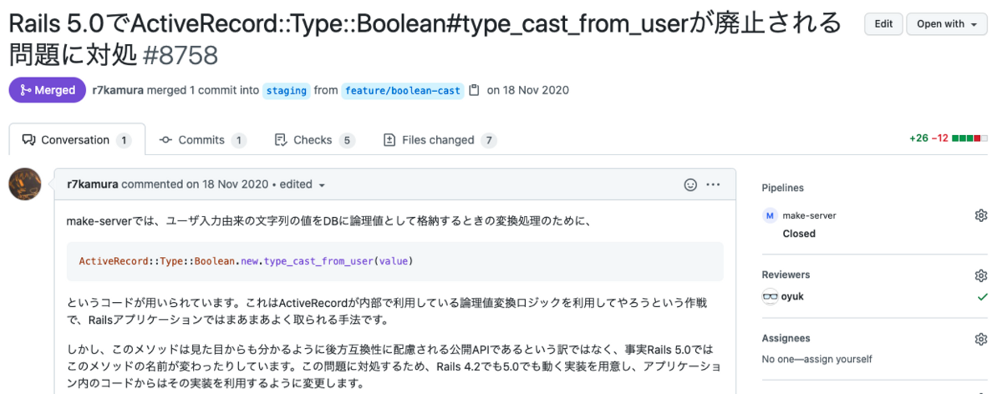 上記の"素直な"コードになる過程でr7kamuraさんからのPull Requestをメンバーがレビューするのですが、その中には詳細に"なぜその変更に至ったか"という理由がありました。