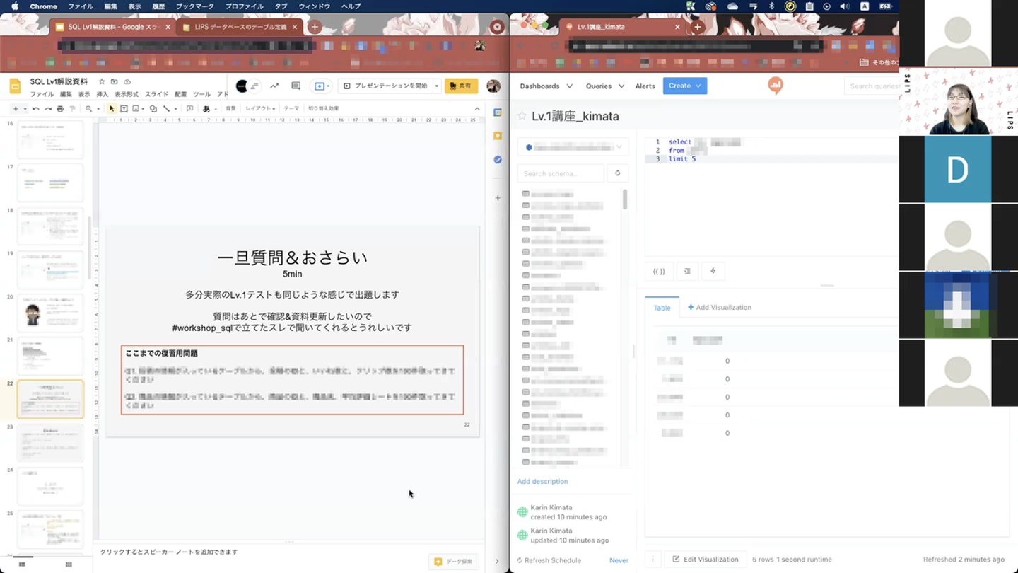 そもそもRedashを触ったことのない人を前提として設計していたので、クエリの作成から、どこにクエリをかけばいいか、クエリを書いたらどのボタンを押して実行するか、結果はどこに出るのかまでをまるっとサポートしたいため、常に講師の画面共有をしながらのハンズオン形式です。