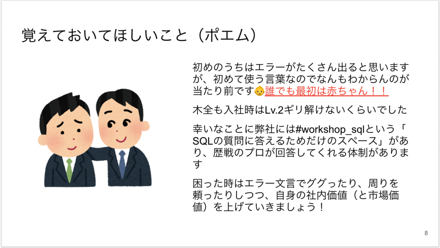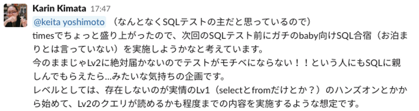 そんな感じで、もともとSQLテストという制度はあったのですが、改めて「SQLようちえん」こと、SQL Lv.1講座及びLv.1テストが生まれた経緯をお話していきます。