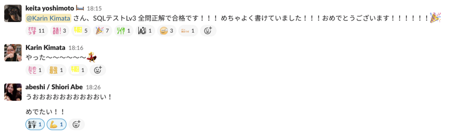 制度を知って速攻チャレンジし、1度目のチャレンジでは不合格だったものの、「確定報酬」と唱えながら就業中に業務に関連したSQLを書いては添削を依頼し(教えてくれたエンジニアの皆さんありがとうございます)、終業後もちまちまと市販のドリルを解き、Lv.3を無事取得。