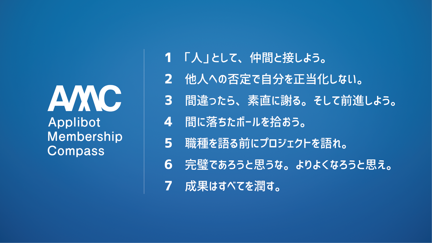 組織で働く上で共通の「意識」も大切だと考えているので、アプリボットでは、「Applibot Membership Compass」(AMC)という考えを掲げています。