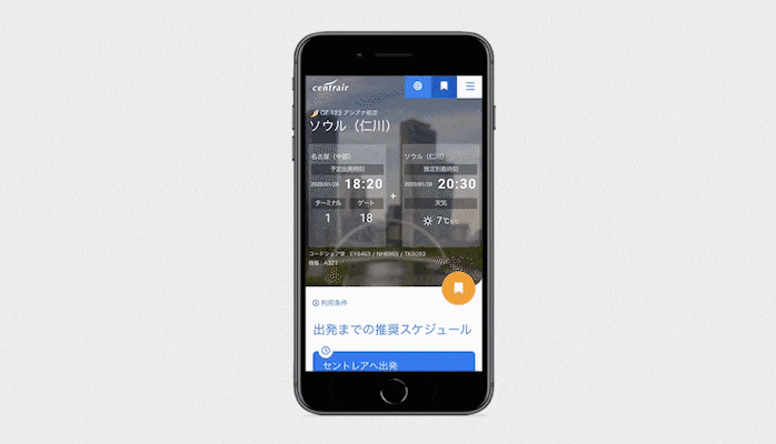 今回、フライト各便に詳細ページを用意。出発便であれば、“空港に到着”してからどういう行程を経て“搭乗”に至るか、目安となる時間を入れて「推奨スケジュール」として紹介。 各行程で表示しているレコメンドは、利用ターミナルやフライトの時間帯、気温差などの条件により、内容を切り替えて表示。利便性を高める施設やサービスなど、ユーザーへ新たな「気づき」を与えます。