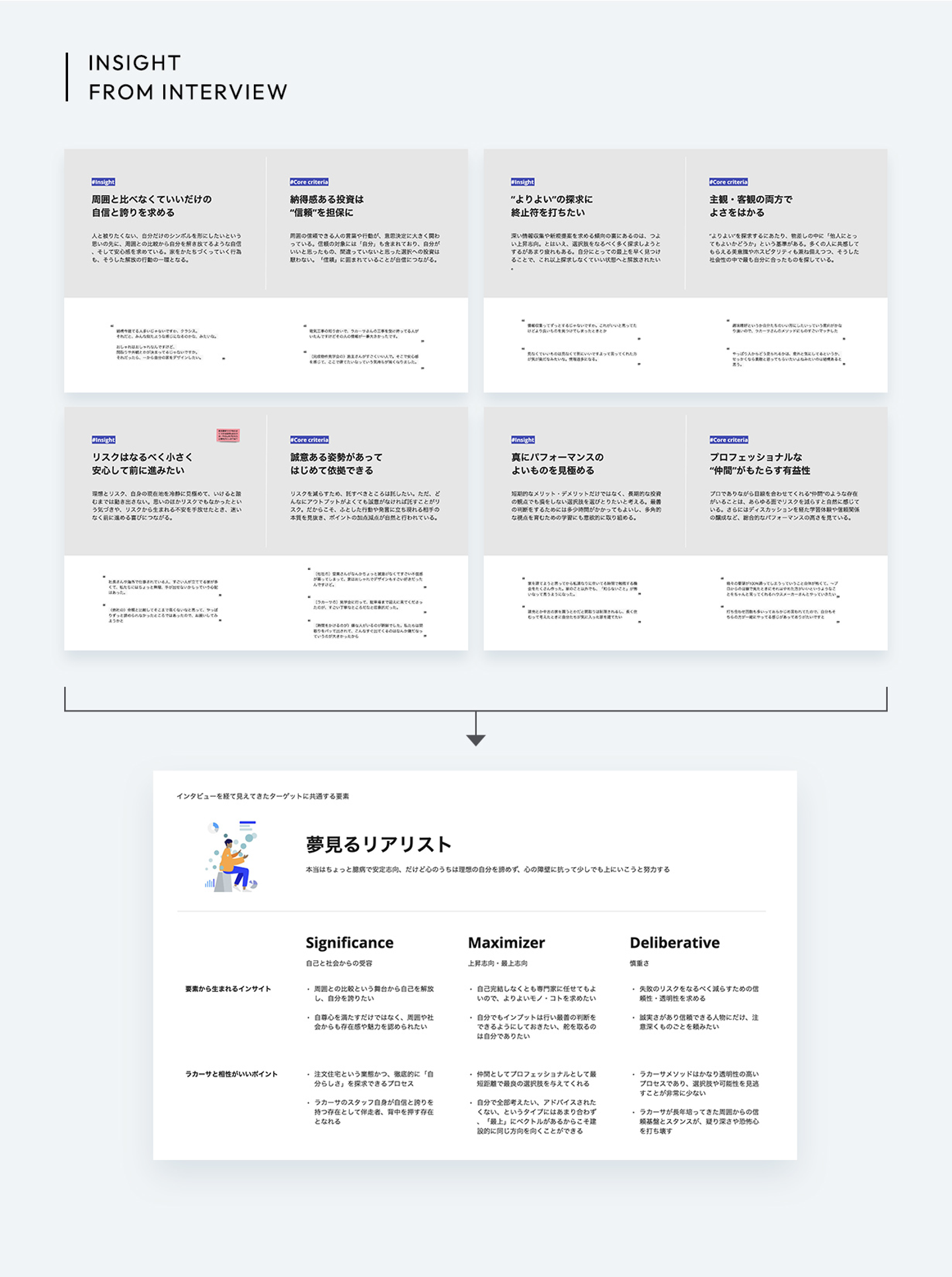 競合と比較した強みや違いは何か。また「メソッド」の体験にはどのような価値があり、価値を感じてくれる顧客にはどのような共通点があるのか。インタビューを通じてブランドのコアを編み出し、「顧客インサイト」および「価値構造図」に落とし込みました。「顧客インサイト」はニーズごとに整理した顧客タイプとは異なり、ラ・カーサと相性のいい顧客に見られる共通の潜在的なインサイトを言語化しています。