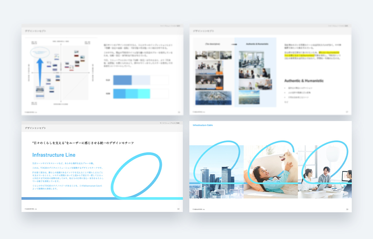 「信頼・安定」「将来性・成長」というイメージを醸成することを目指し、TOGIS様へのヒアリングや現状分析、競合調査といった工程を踏まえ、デザインコンセプトやキャッチコピーの作成を行いました。企業を想起させるイメージカラーは大きく変えず、爽やかさや明るさをプラスしたカラートーンを採用し、印象を刷新。また、他グループ企業と差別化するため、"Infrastructure line"というモチーフをキービジュアルにあしらいました。このモチーフは、TOGIS様のさまざまなソリューションが、生活の中で欠くことのできない基盤になっていること、生活を丸ごと支えていることを象徴しています。
