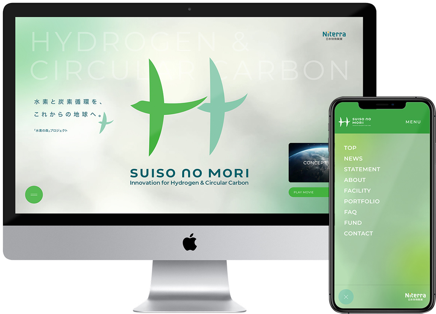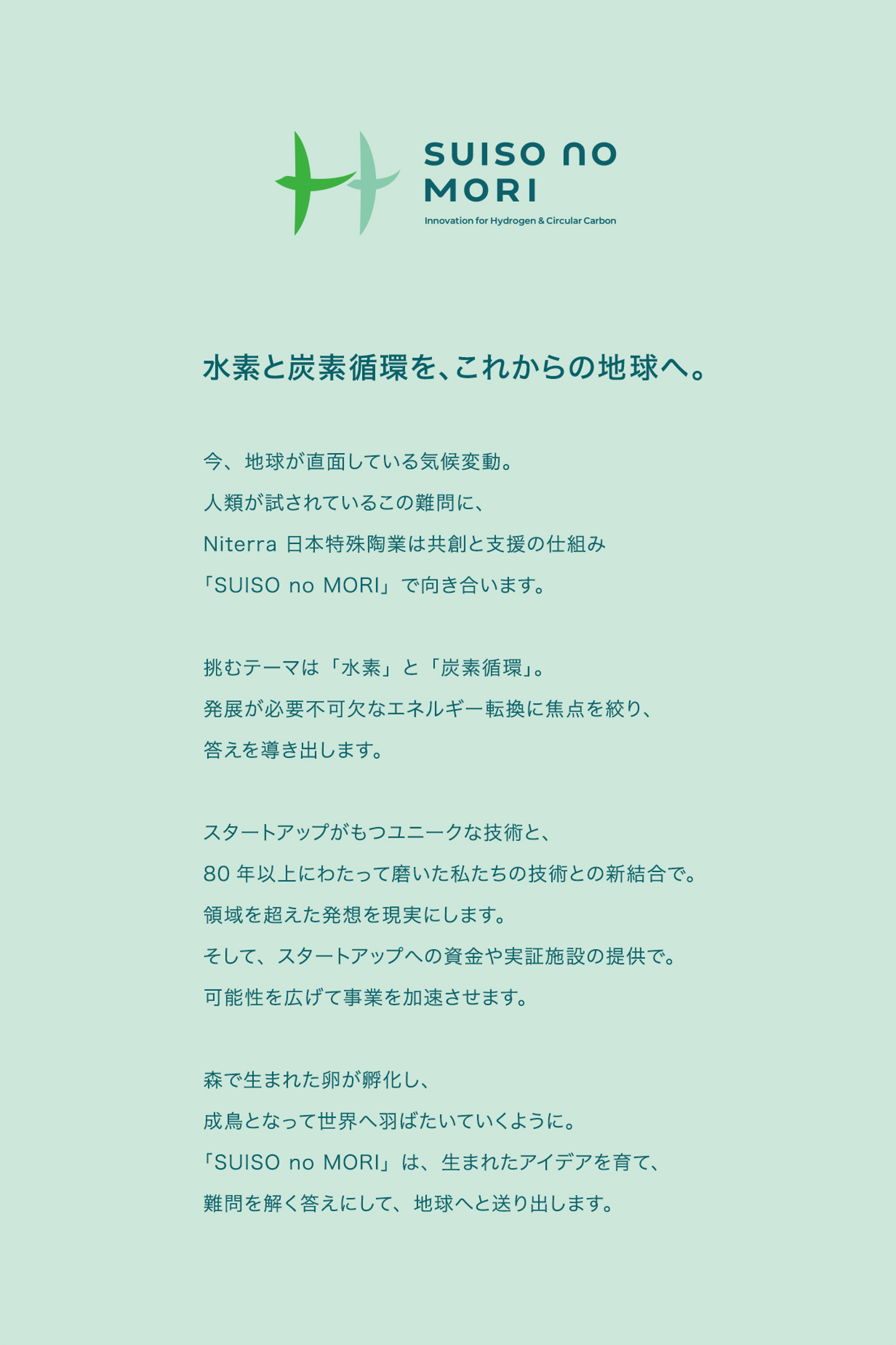 SUISO no MORI のアイデンティティを具体化するために、まずはロゴとステートメントを制作。シンボルは、スタートアップのユニークな技術と、80年に渡って磨いた日本特殊陶業の技術、これらの新結合を2 羽の鳥でかたどる「H(水素原子)」で表現しました。森で生まれた卵が孵化し、成鳥となって世界へ羽ばたいていくように。生まれたアイデアを育て、難問を解く答えにして地球へ送り出すという、「SUISO no MORI」の姿勢そのものを表すデザインです。