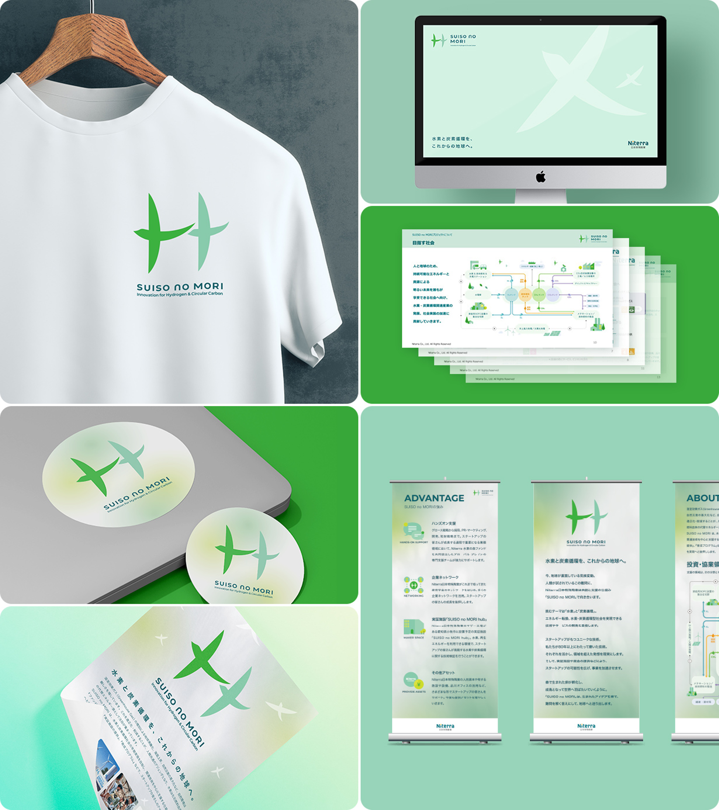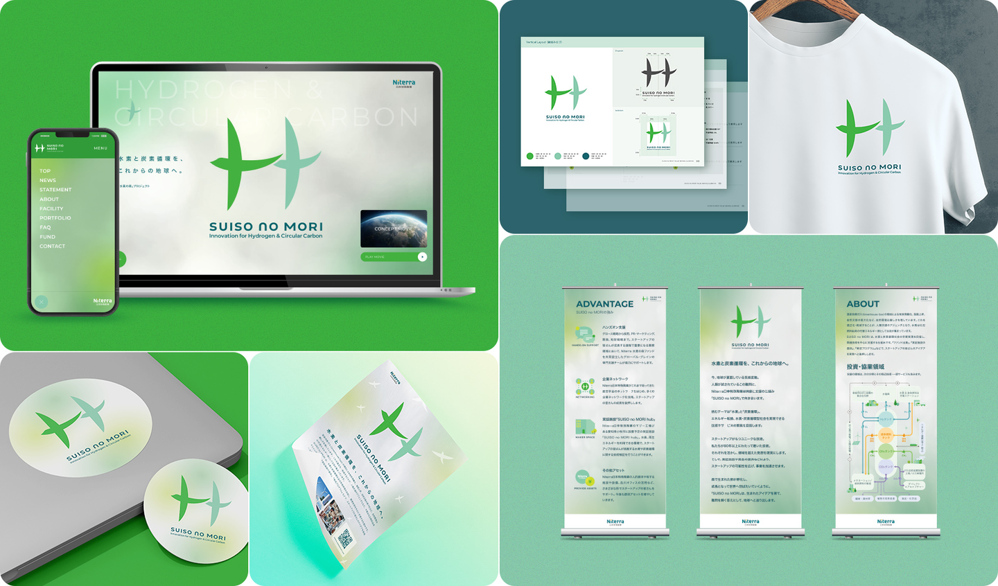 Niterra グループ 日本特殊陶業の SUISO no MORI(「水素の森」プロジェクト)は 、水素と炭素循環社会の早期実現を目指し、関連技術を中心にスタートアップを支援する仕組みです。アクアリングは、制作プロセスの中で「SUISO no MORI」らしさを見定め、具体化し、プロジェクトチームがより自信をもって始動できるように、さまざまなアウトプットでブランド支援をしました。