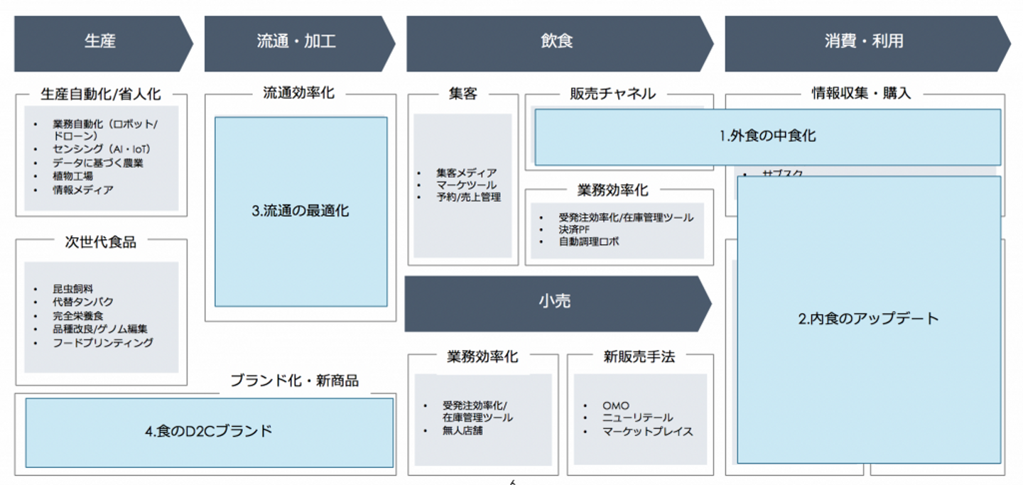 このように大きなポテンシャルがある食領域ですが、具体的にはどのような領域で新しいプロダクト・サービスが生まれているのでしょうか?