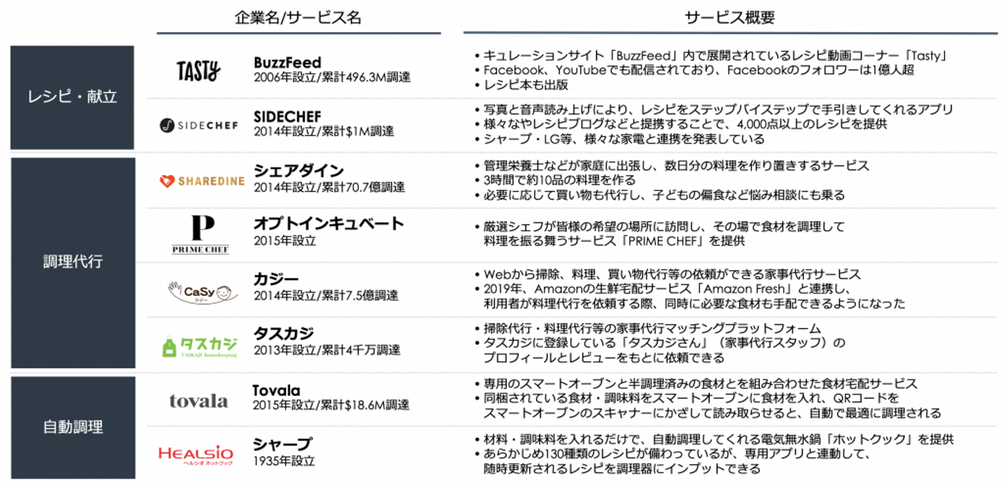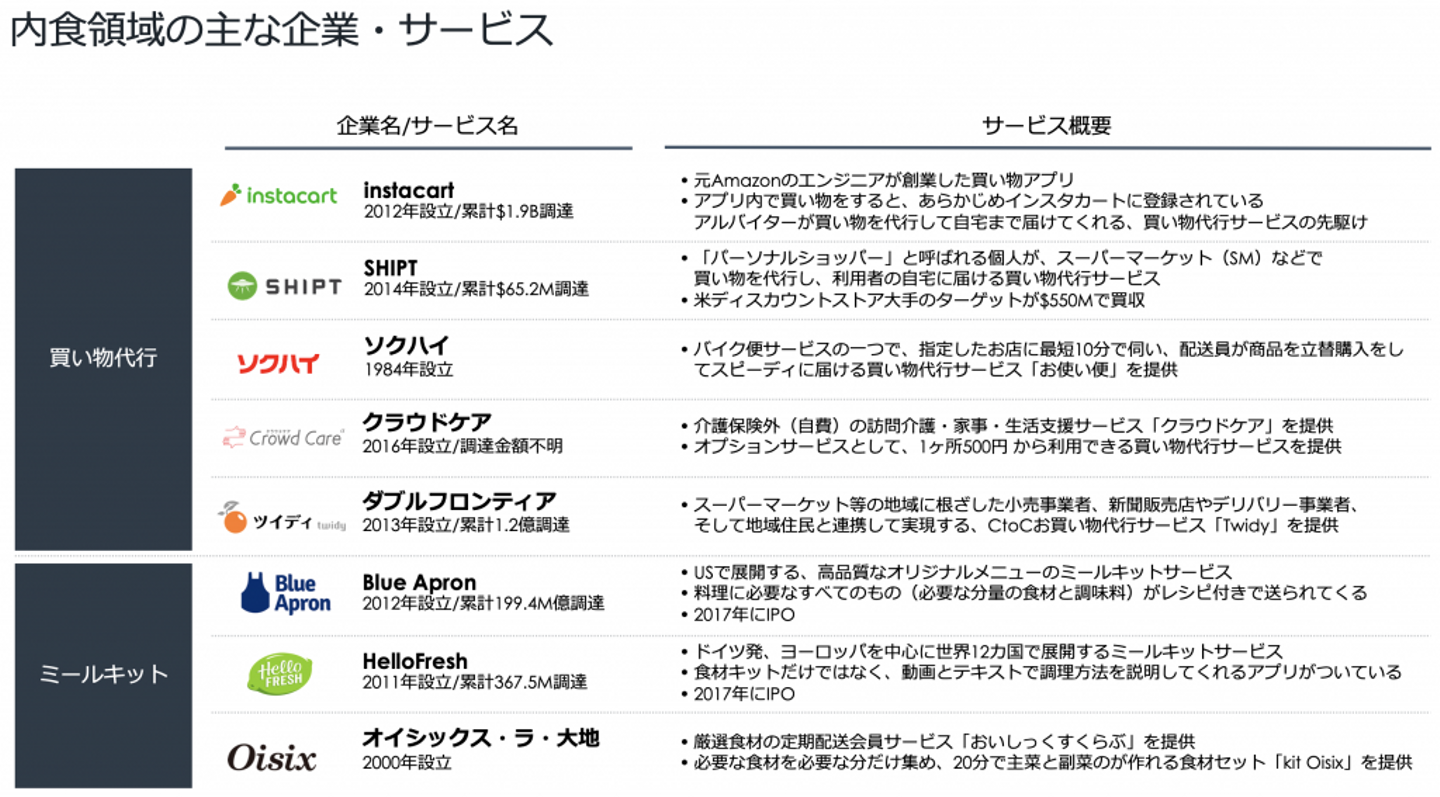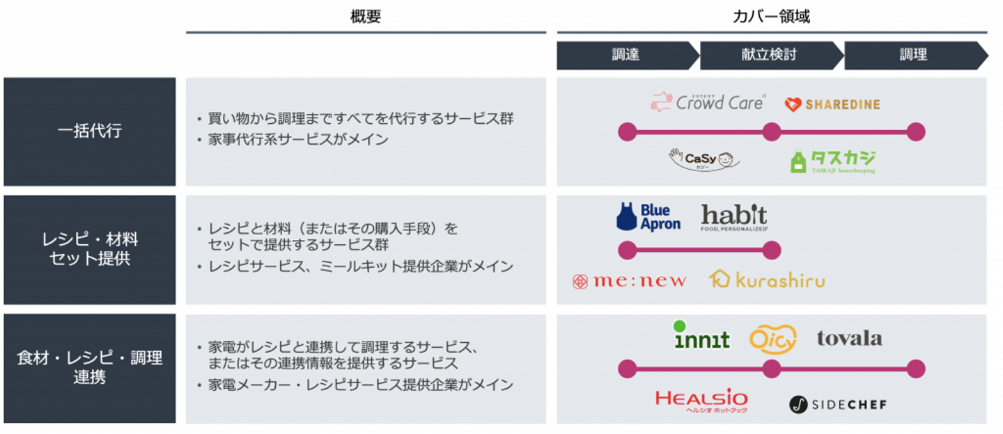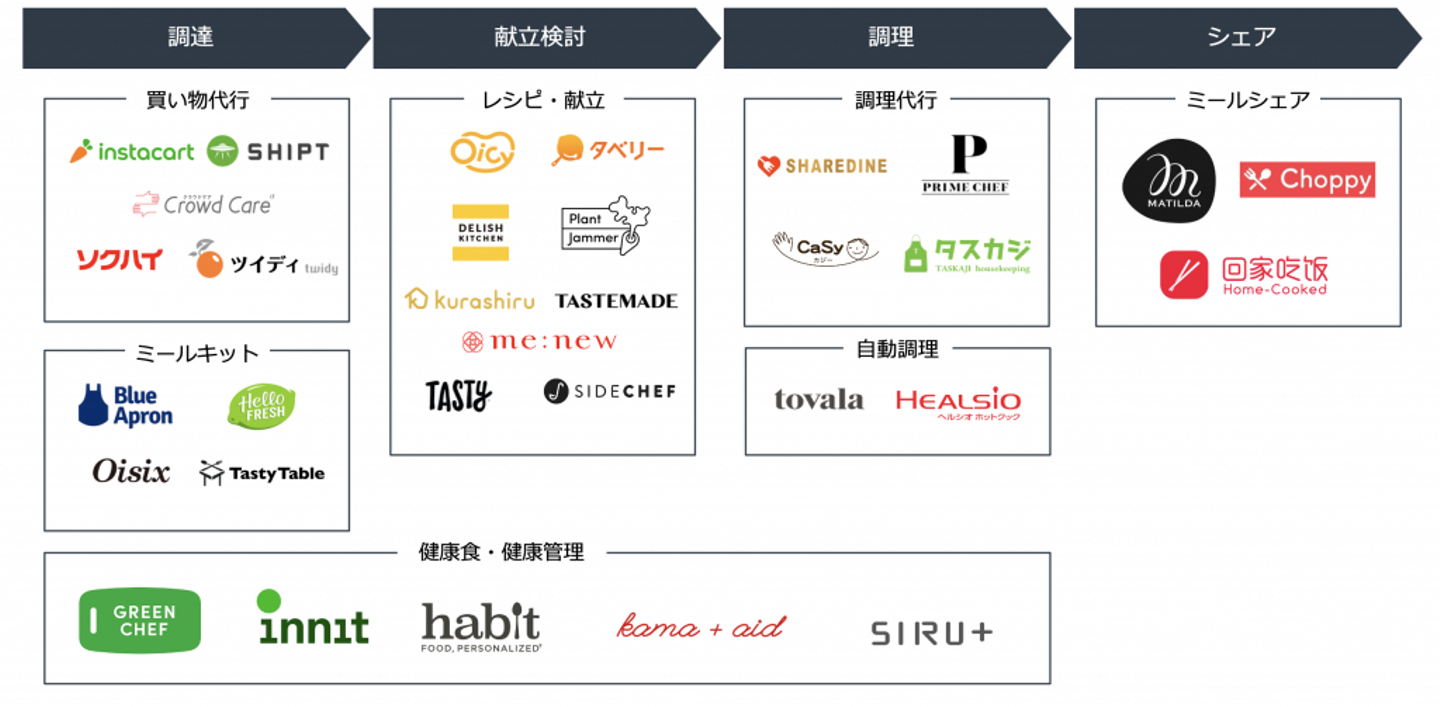 ミールキットやレシピサービスなどは比較的認知度が高いと思いますが、アメリカで普及している買い物代行サービスや、中国で普及しているミールシェアサービス等については、国内ではまだ普及しておらずプレイヤーも少ないため、今後の動向が注目される領域です。