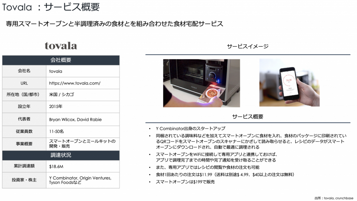 例えば、アメリカのtovalaではスマートオーブンを販売しつつ、レシピ付き食材もサブスクリプションサービスとして提供しています。しかも、オーブンと食材・レシピの連動性が高く、送られてきた食材の包装についているQRコードをスマートオーブンのスキャナーで読み込むと、レシピのデータがスマートオーブンにインプットされ、自動的に調理される仕組みになっています。
