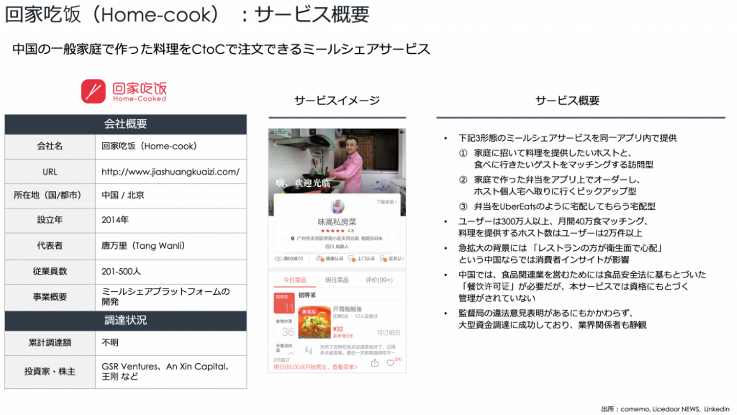 回家吃饭は、中国で流行しているミールシェアサービスです。「ミールシェア」とは「家庭で作った料理を販売したい人」と「家庭料理を食べたい人」をアプリ上でマッチングするサービスで、いわば家庭料理版Uberです。中国では、既に本サービスの利用者が300万人以上、料理を提供するホストは2万件以上存在しています。