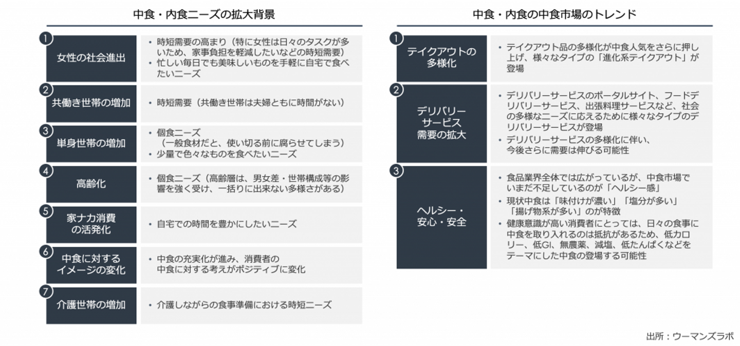 中食・内食に共通して、自宅の近辺や自宅の中で食事するニーズは年々高まっていますが、その背景には、人々の暮らし方や働き方、生き方の変化・多様化と、消費者の食サービスに対する受容性・ニーズが高まってきたこと、また良質な中食・内食のサービスが充実してきたこと等が挙げられます。