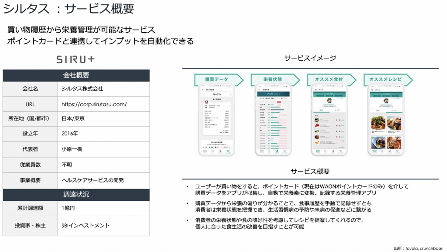 また、国内で展開する「シルタス」では、スーパーで買い物した食べ物のデータをアプリが栄養素に変換・記録した上で、ユーザーの栄養状態と食の嗜好性をもとにしたレシピを提案しています。