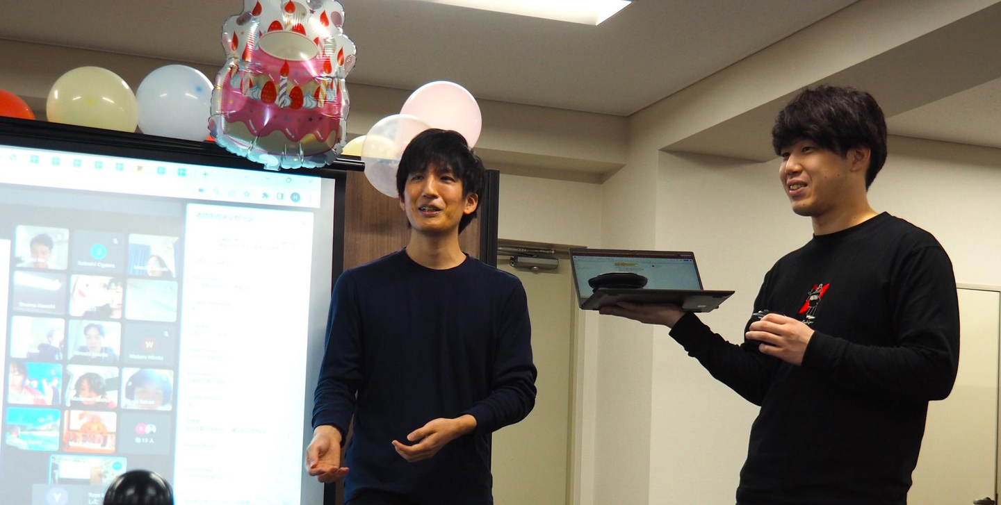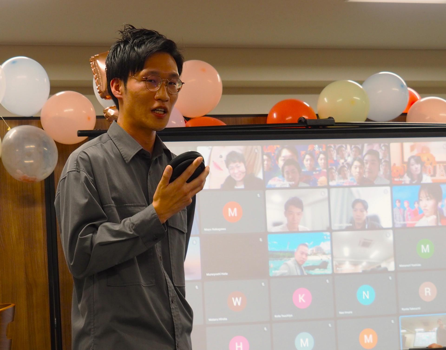 写真は”二年目”パートを語るエンジニア責任者の渡邊です!入社理由である代表岩木のストーカーばりの口説きについてや、開発の歴史なんかを語ってくれました!