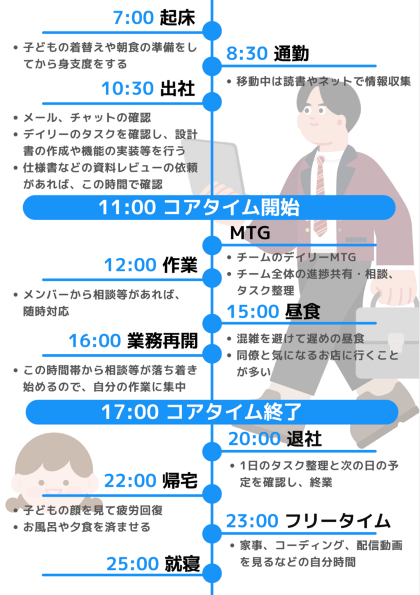 - 働き方:リモートと出社をそれぞれ週2-3回のハイブリッド勤務。子どもがまだ小さく妻の負担が大きいため、出社が必要な業務がない日はリモートワークを活用している。