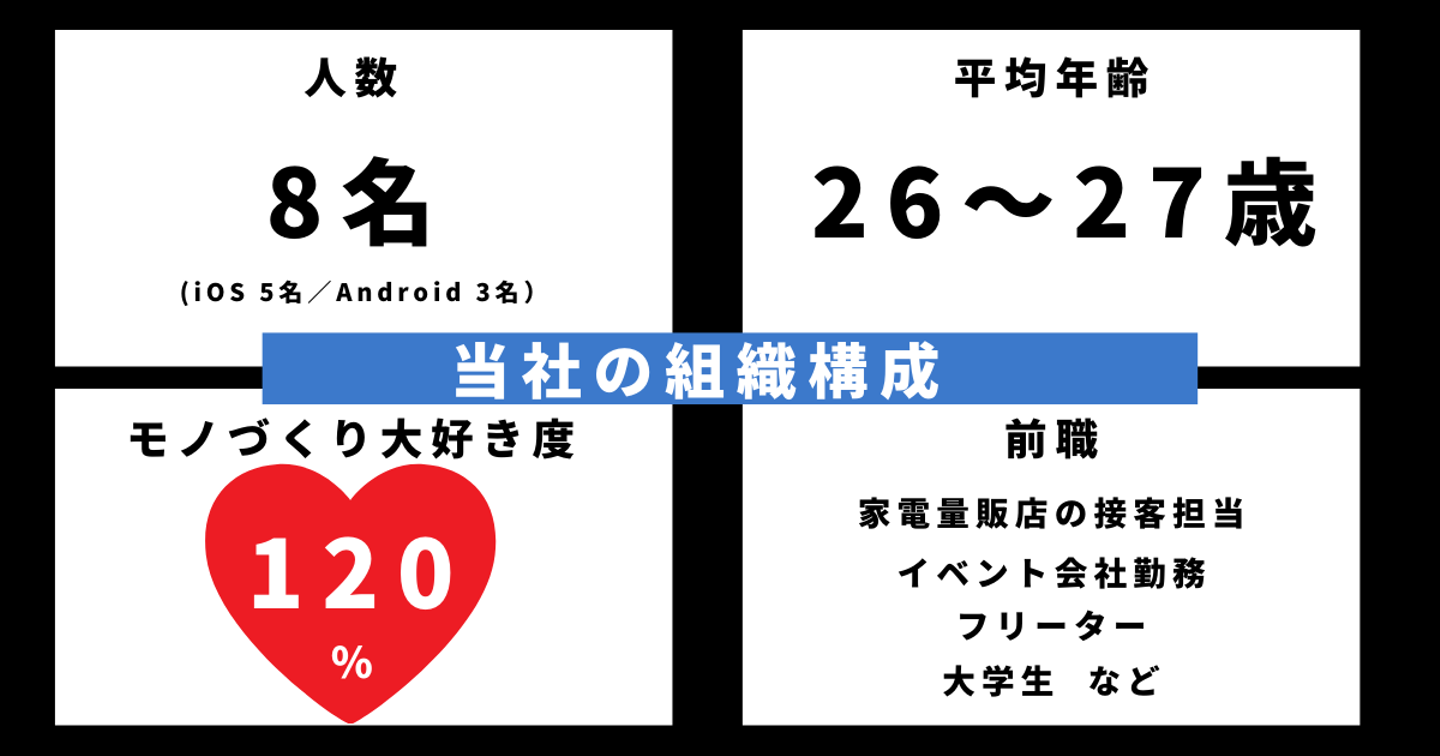 当社のネイティブアプリ開発チームの組織構成は、上記の通り。少数精鋭の組織で、大手企業様向けのネイティブアプリをゴリゴリ開発しています!