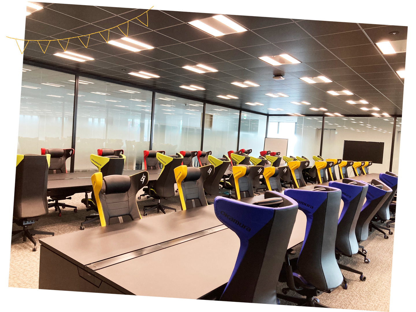 プレイヤーがより快適に集中してゲームで勝利するための椅子、STRIKERのゲーミングチェアが40脚ずらっと並ぶ弊社自慢のエンジニアルームです。