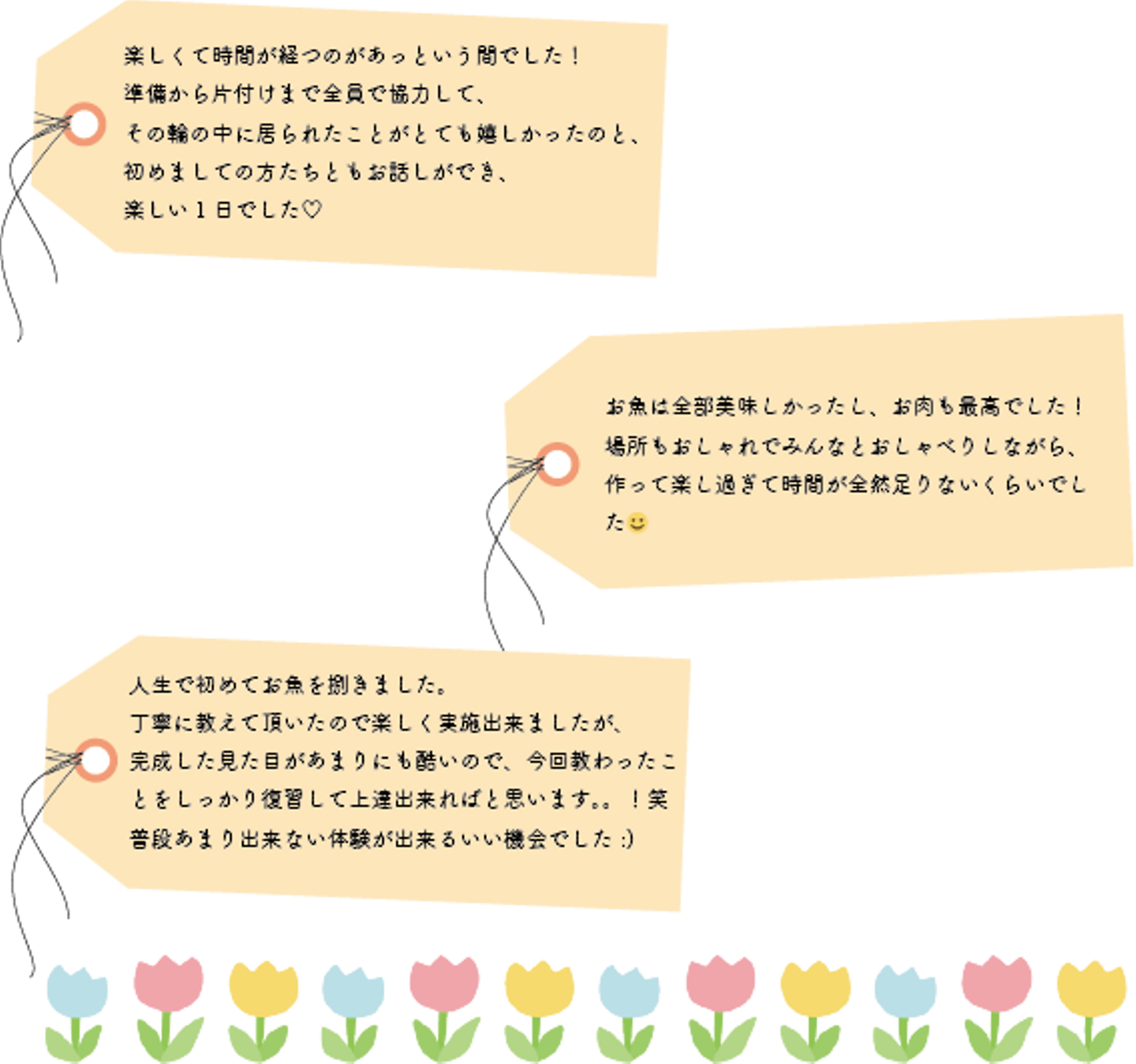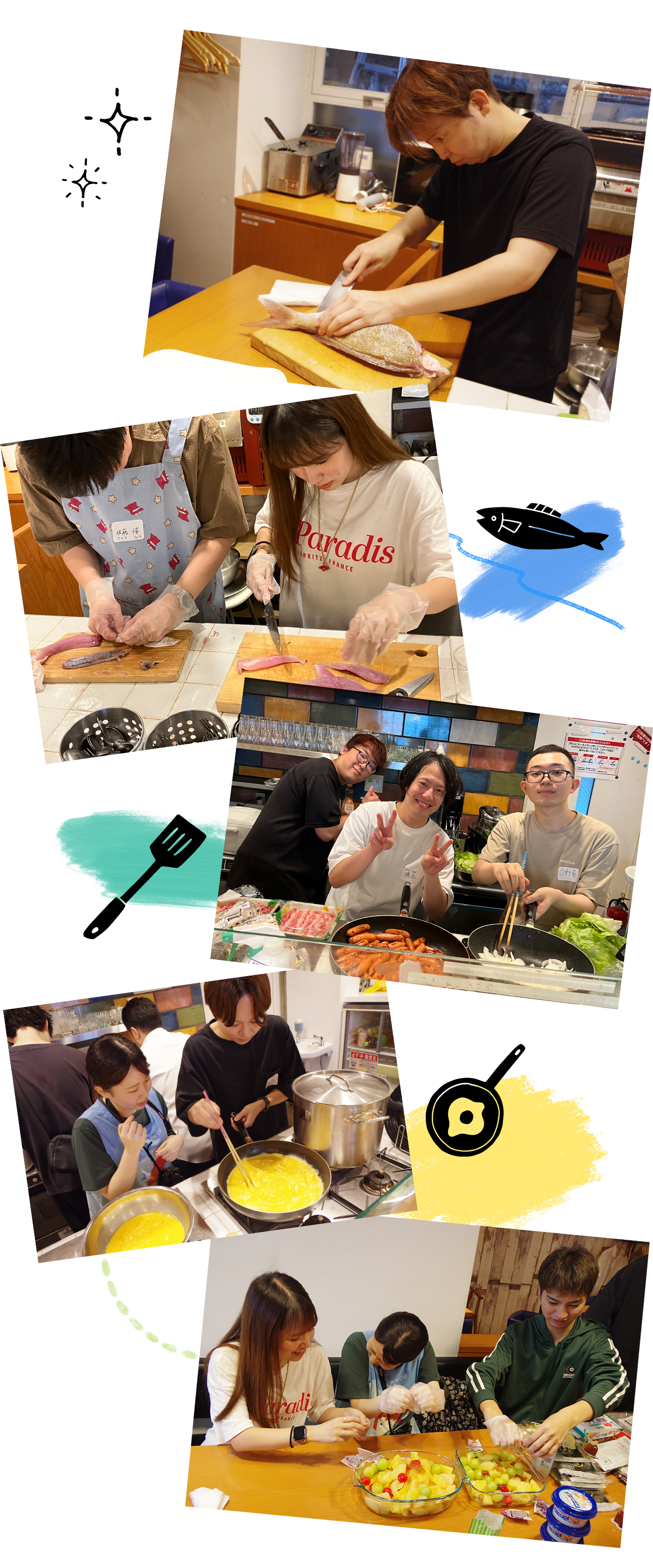 例えば、料理があまり得意ではない人が得意な人に教えてもらったり、魚を捌くような普段は中々できない体験ができたり‥