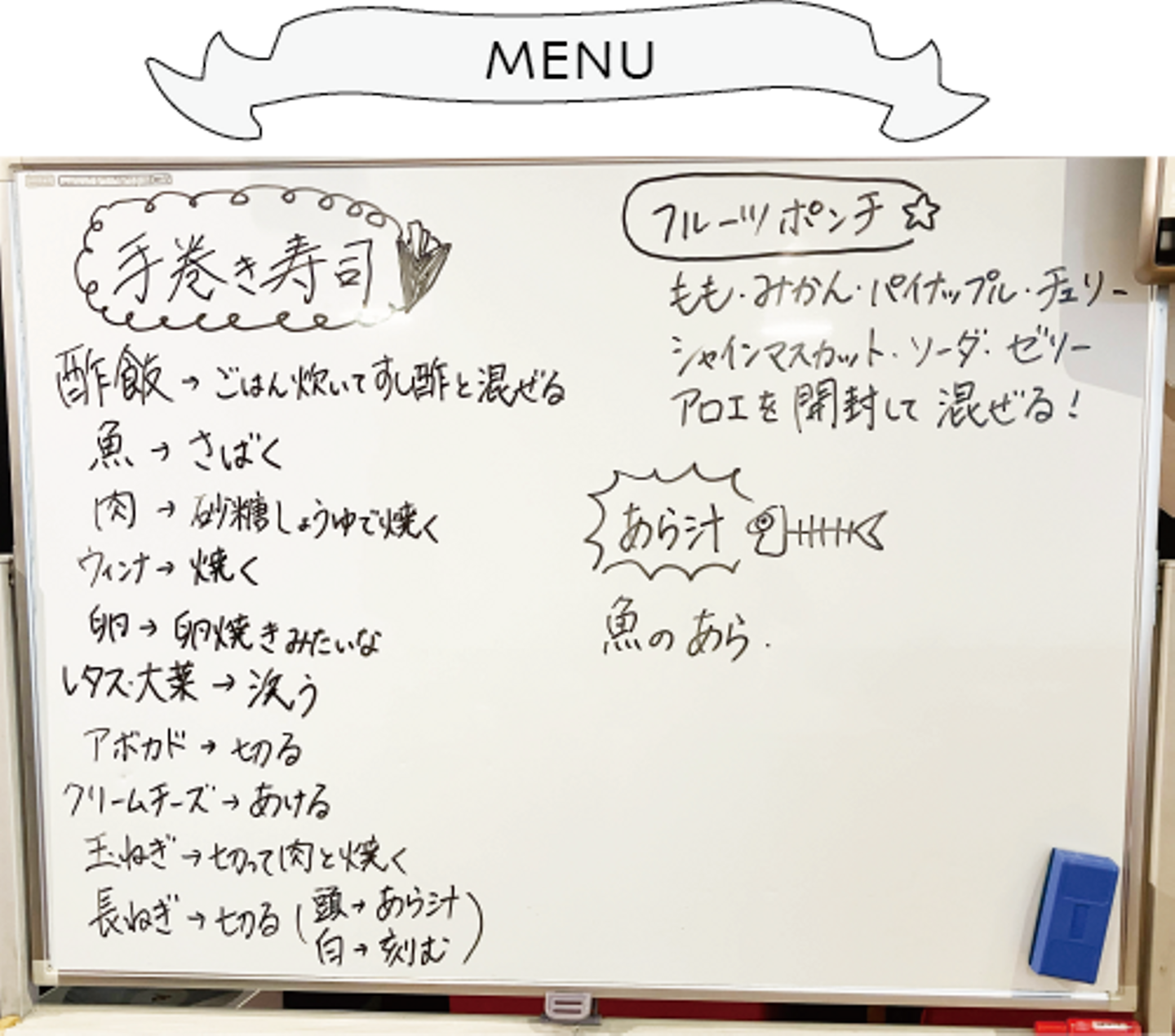 今回は「手巻き寿司🍣」「フルーツポンチ🍒」「あら汁🐟」を作りました!
