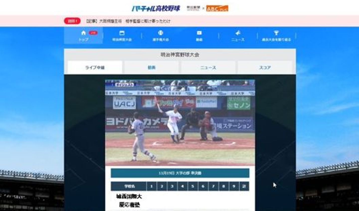 朝日放送テレビ(ABC)と共同運営している高校野球の総合サイト「バーチャル高校野球」では11月15日から20日まで、明治神宮野球大会の高校の部、大学の部あわせて全19試合をライブ配信しました。高校の部は、秋季地区大会を勝ち抜いた新チーム10校が出場。中京大中京(東海・愛知)が「秋の日本一」に輝きました。