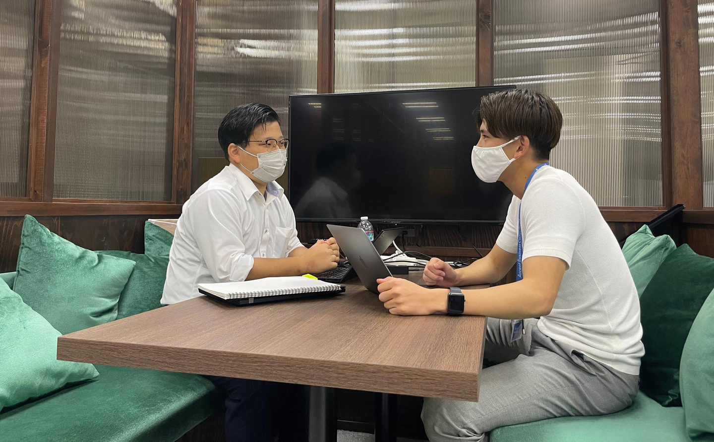 大森:ABCはフリーアドレスなので、基本的に仕事をする場所は決まっていません!役員の近くで仕事をできることもABCの魅力の1つだと思います。わからないことがある時は、廣瀬専務に最短距離で質問しに行けます(笑)