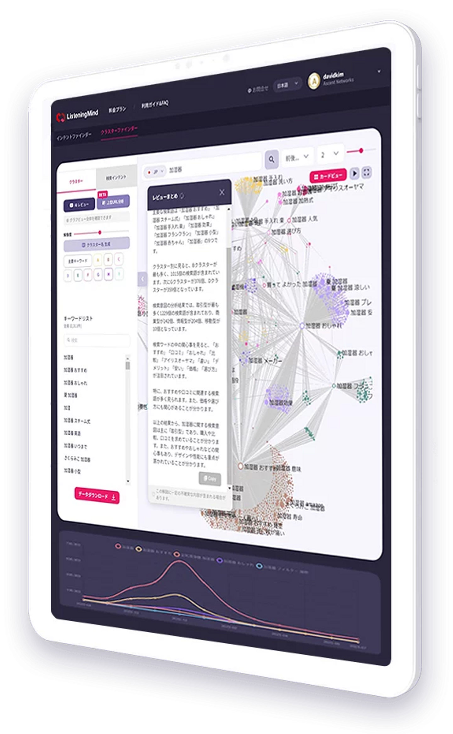 データが数値化、視覚化されても、そこから何を読み取り、どう施策につなげるかはマーケティング担当者の個人的な能力に依存し、負担となっていました。Listening-Mindでは、AIを活用して、 ”いま何が現れているのか” を言語化。データの解釈と施策の立案を支援します。