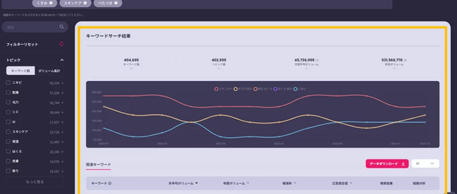 リスニングマインドの機能・特徴Intent Finder消費者の検索意図を分析する消費者のインターネット上での行動と、動機を知りたいですか ?Intent Finderは、ユーザーの行動と動機を探り出す先進的な分析ツールです。最大100個までのシードキーワードから、重要な関連キーワードを取り出し、検索ボリュームに基づいて詳細化します。ブランドや製品に関する消費者の検索行動の細部を明らかにし、マーケティング施策とブランド・リフトの成果について評価することを可能にします。 Intent Finderが消費者の購入意欲を分析し、コミュニケーション戦略を支援することで、マーケティング担当者は、今...