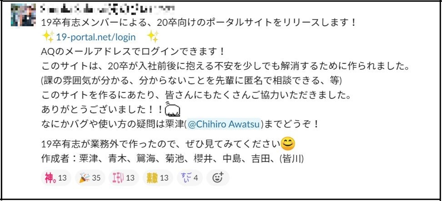Slackにて、ほとんどの社員さんが参加しているチャンネルでの告知も