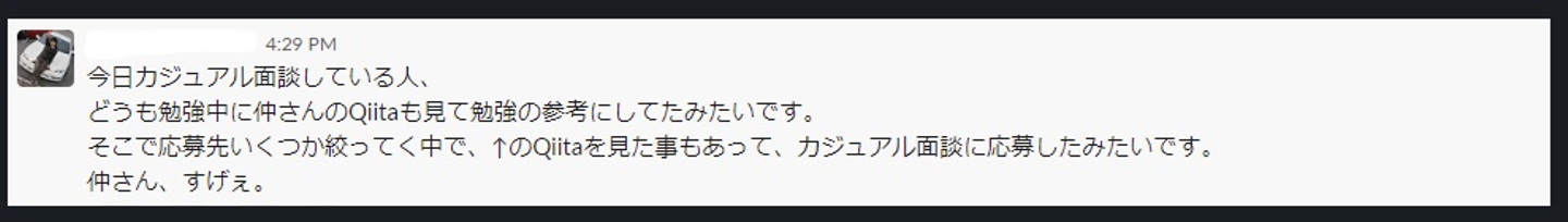 中途採用のカジュアル面談時に「社員のQiitaを見て応募しました!」と言ってくれた候補者の方がいました。