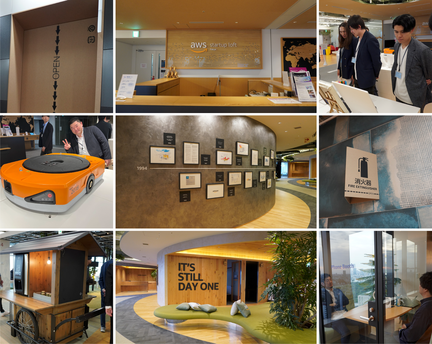 オフィスは全体的に木目調を基調としていて、明るく綺麗でした。また、屋台のようなドリンクサーバーや、Amazonのダンボール柄の消火器表示プレートなど、遊び心盛りだくさんでした。