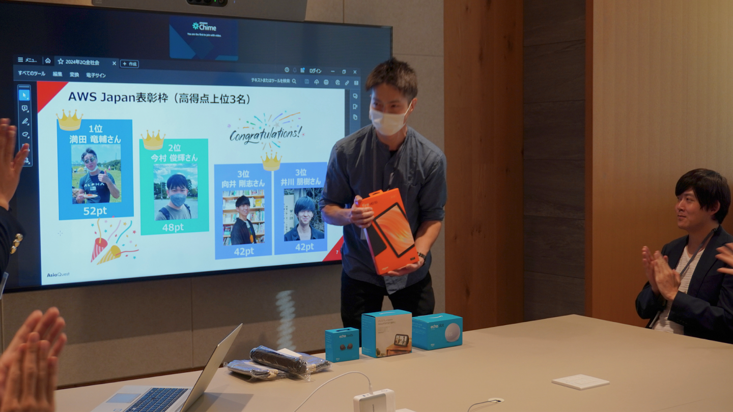 ↑AWS Japanからの賞品を受け取る満田さん