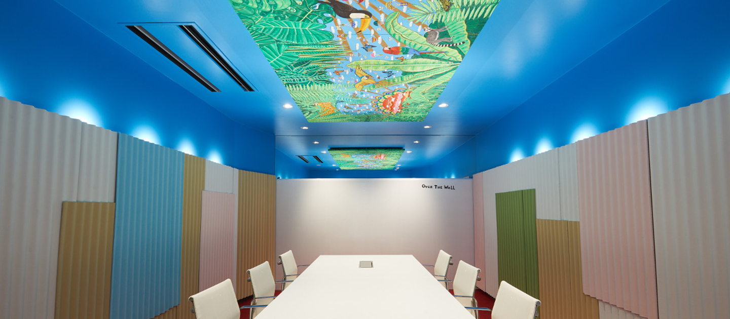 当社の行動理念の一つである「愛」をテーマとした会議室。世界の貧困地帯でアート活動を行っている芸術家がアートワークを担当しており、壁面の「OVER THE WALL」というメッセージの通り、様々な壁を超えて届けられる愛とそれを支える行動力が部屋全体で表現しています。
