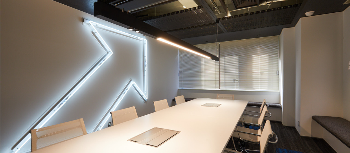 当社の行動理念の一つである「行動力」をテーマとした会議室。「行動力」を表現する大型のネオン管アート作品を設置しています。