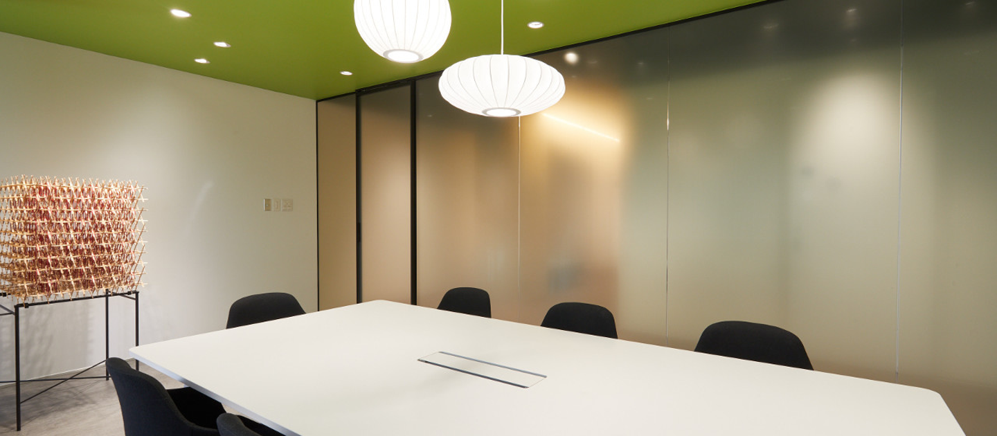 当社の行動理念の一つである「倫理観」をテーマとした会議室。倫理観をモチーフとした竹細工アート作品を設置しており、自然光を活かすことで印象的な影を室内に投影しています。