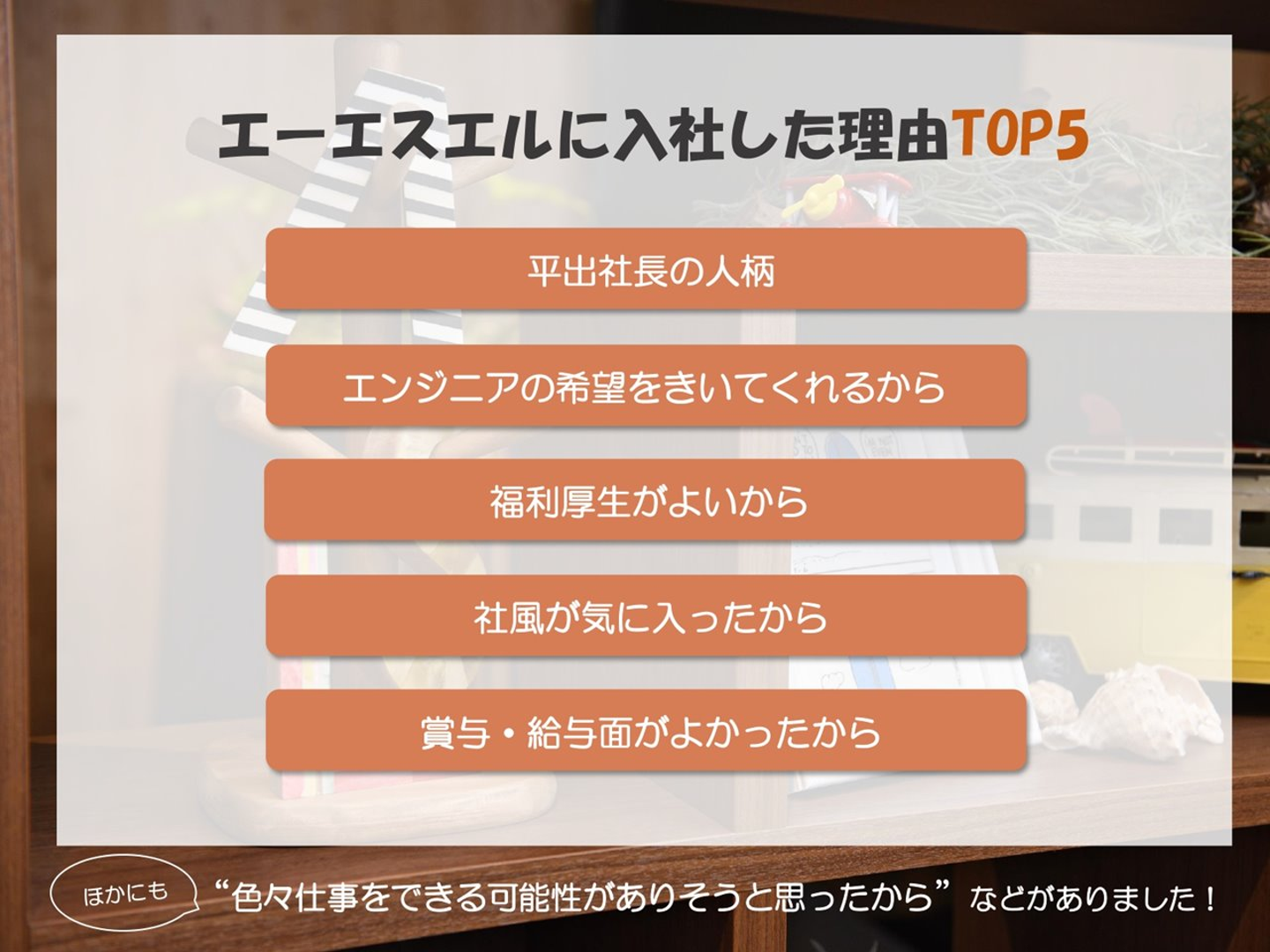 エーエスエルは大企業ではないので、メンバーどうしの距離が近い。それだけに、社長の人柄や働く現場の社風が気になるし、入社の決め手にもなるケースが多いんでしょうね。アンケートでは、「社長の人柄」「エンジニアの希望をきいてくれるから」「福利厚生がよいから」などが上位に来ていますね。ここで、佐々木さんにも聞いてみましょう。
